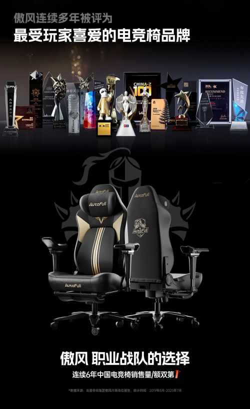 此次双奖加冕,是傲风长期坚持“科技领先”与“设计驱动”发展路径的必然成果。作为中国电竞椅销量第一品牌,傲风已连续六年在销量与市场占有率上位居行业榜首,其背后是超过600项技术专利的积淀与国家级标准实验室的严格品控。未来,傲风将继续秉持“想赢坐傲风”的品牌信念,以设计、工艺与科技的持续突破,为全球玩家带来更多兼具顶尖性能、卓越设计与舒适体验的电竞装备,持续引领电竞座椅行业向更高品质、更具创新性的方向发展。
