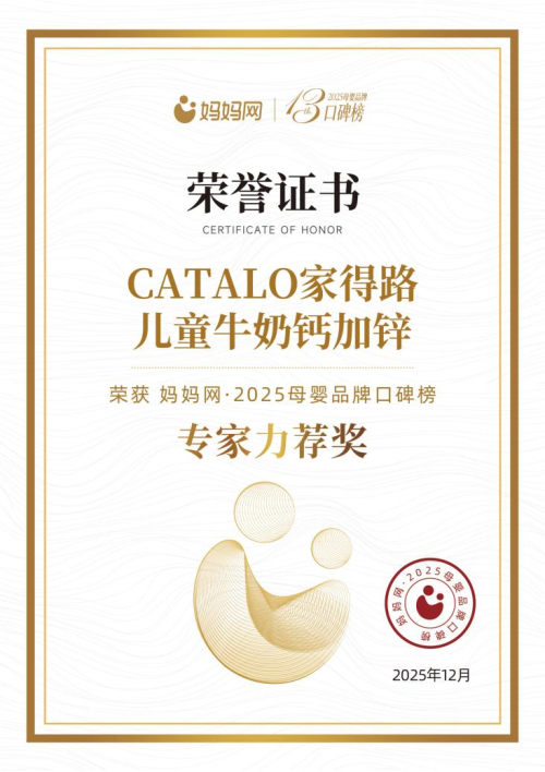 荣获2025 妈妈网·母婴品牌口碑榜“专家力荐奖”,不仅是对 CATALO 家得路儿童牛奶钙加锌产品力的肯定,更是万千妈妈对“天然、安全、效果好”的真实认可。未来,CATALO 将继续以科学研发为驱动,以天然营养为根基,为更多家庭打造真正有效的成长支持,陪伴孩子迈向更健康、更强壮的未来。