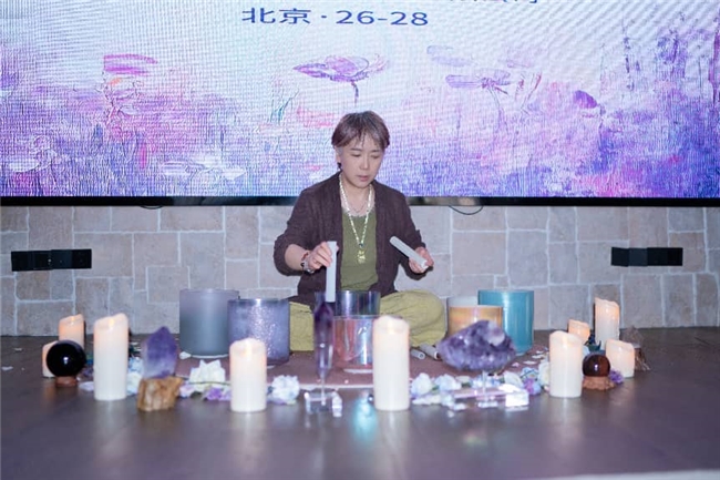 自2015年起开启疗愈师生涯、得尼泊尔宗师亲传颂钵密钥的旻楠老师,带来水晶钵音浴体验。她通过演奏水晶钵,使其纯净声波与人体细胞共振,校准能量系统、平衡脉轮通道,让身心在悠远共鸣中回归宁静;其主导的“世界的总和是关系”环节,使参与者通过自我抚触与内心对话,觉察内在深层情绪,更帮助一位参与者实现了与最纯真时的自己(心理学称为内在小孩)的温柔对话。