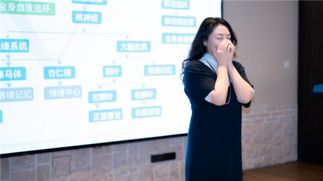 精油生活化推广大使、精油芳香疗法师薇薇安老师的芳香疗愈则以嗅觉为引,带领大家感受不同精油带来的情绪波动,两两一组的手部抚触与精油涂抹,让温暖触感与芬芳气息共同构筑起放松的疗愈场域。