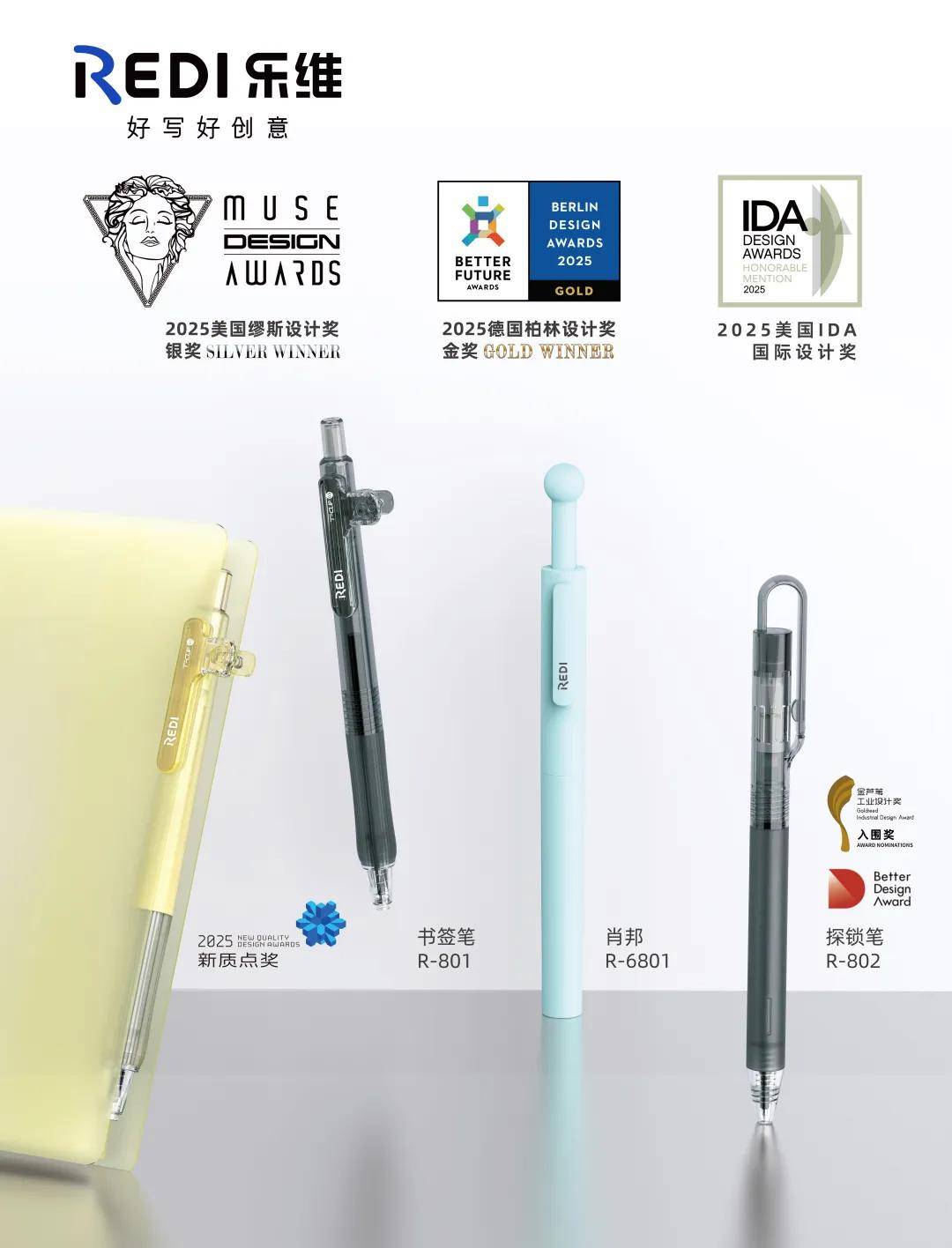 这是REDI乐维继美国缪斯设计奖银奖、德国柏林设计奖金奖后,于短短一年内斩获的第三项国际权威设计殊荣,为中国国货文具赢得世界殿堂级的赞誉,让世界看见中国创造的力量。