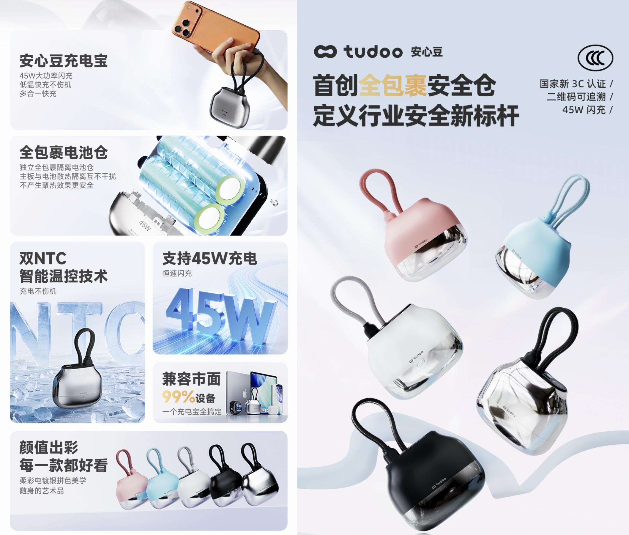 tudoo安心豆充电宝通过"结构防护+智能监测+合规认证"的全链路安全体系构建,不仅满足了商务出行、旅游等场景的安心使用需求,更树立了移动电源行业的安全技术标杆,其"可溯源、不发烫、易携带"的产品特性,正推动消费电子安全防护从被动防御向主动守护升级。