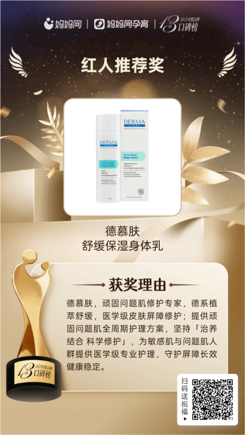12月19日,2025妈妈网母婴品牌口碑榜正式揭晓。德慕肤舒缓保湿身体乳凭借其卓越的舒缓保湿体验与温和有效的配方体系,在真实口碑与专业评鉴中表现突出,荣获“红人推荐奖”。这份荣誉,是万千用户与专业领域对其产品力的共同认可。