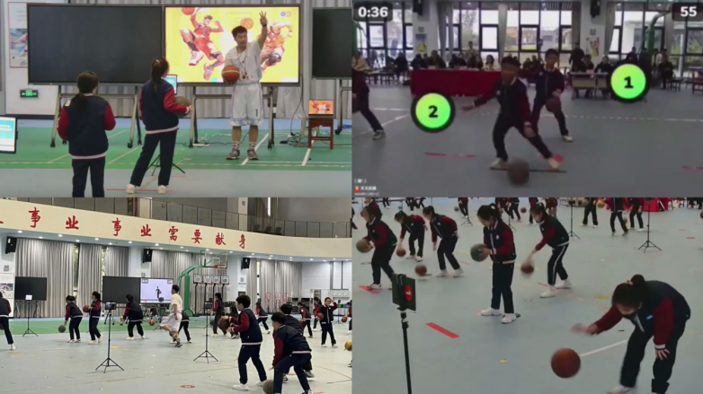 这堂课以 “篮球小将挑战赛” 为情境,依托体智云AI体感技术打造 “运球算数”、“运球侧滑摸桩”、“投篮大比拼” 三大模块:“运球算数” 实现篮球与数学的跨学科融合,体智云动作捕捉技术同步监测运球连贯性与姿势规范;“运球侧滑摸桩” 通过动态动作分析追踪位移速度与平衡度,屏幕提示让训练更具游戏感;“投篮大比拼” 则以虚拟情境模拟实战,反馈投篮衔接动作的流畅度。