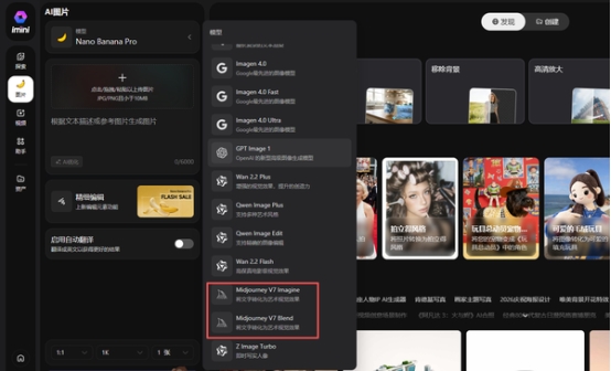 上述就是MidjourneyV7这个模型来自哪个软件且怎么使用的全部内容,如果想要轻松用上MidjourneyV7,那么推荐在imini上使用,如果平时想调用Nanobanana之类的模型,也可以一键切换使用。