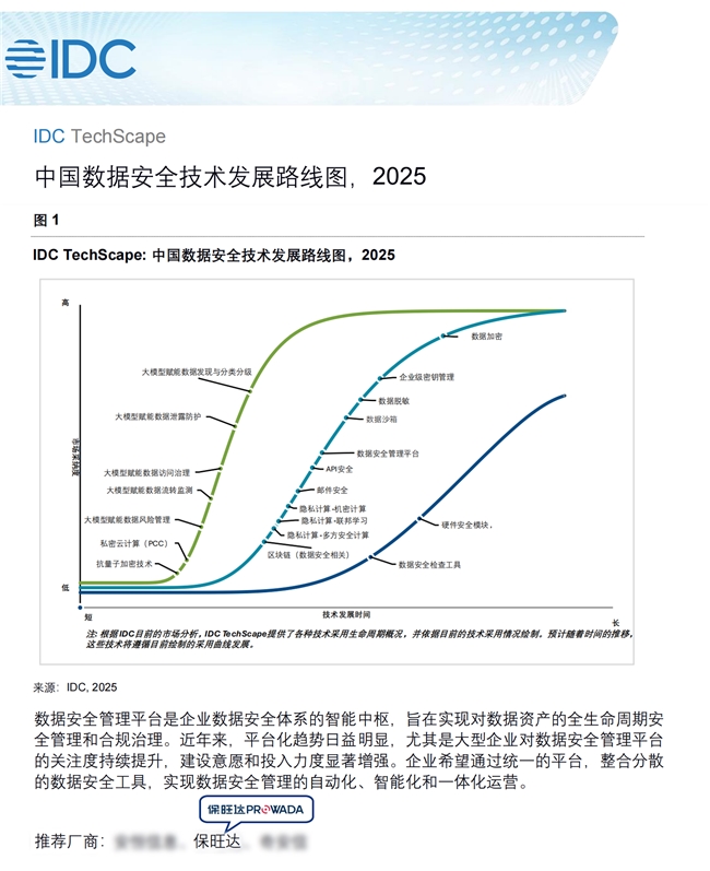 近日,IDC正式发布《中国数据安全技术发展路线图,2025》(December 2025, IDC# CHC53930425)。报告从数据安全产品技术能力入手,给出IDC在不同技术领域下的产品推荐厂商名录。保旺达数据安全管理平台凭借扎实的技术积累和AI创新落地能力,成为IDC重点推荐的中国数据安全技术代表厂商。