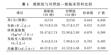 如上图所示,2组患者的性别、年龄、体质量指数、发病至入院时间及出血量比较,差异无统计学意义,具有可比性。