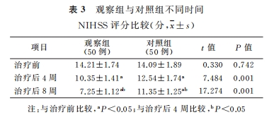 如上图所示,2组治疗前NIHSS评分比较,差异无统计学意义;观察组治疗后4周及8周NIHSS评分明显低于对照组,差异有统计学意义。2组治疗后4周及8周NIHSS评分较治疗前明显降低,且治疗后8周NIHSS评分较治疗后4周明显降低,差异有统计学意义。