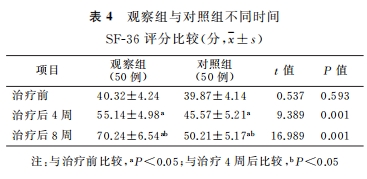 如上图所示,2组治疗前SF-36评分比较,差异无统计学意义;观察组治疗后4周及8周SF-36评分明显高于对照组,差异有统计学意义。2组治疗后4周及8周SF-36评分较治疗前明显升高,且治疗后8周SF-36评分较治疗后4周明显升高,差异有统计学意义。