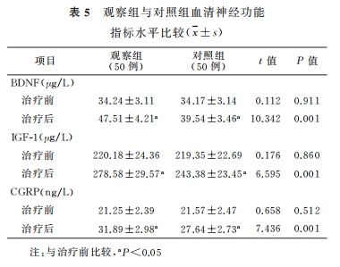 如上图所示,2组治疗前血清BDNF、IGF-1及CGRP水平比较,差异无统计学意义;观察组治疗后8周血清BDNF、IGF-1及CGRP水平明显高于对照组,差异有统计学意义。2组治疗后8周血清BDNF、IGF-1及CGRP水平较治疗前明显升高,差异有统计学意义。