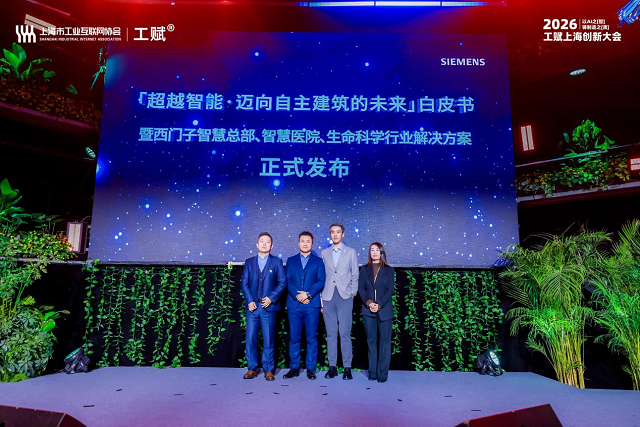 《超越智能·迈向自主建筑的未来》白皮书,暨西门子智慧总部、智慧医院、生命科学行业解决方案正式发布。会上,西门子智能基础设施集团副总裁/智能建筑事业部总经理孙靖博士、西门子智能建筑事业部总监张凯、西门子智能建筑事业部东中区总经理何东林、西门子上海地区销售总监郭兰共同见证了这一时刻。
