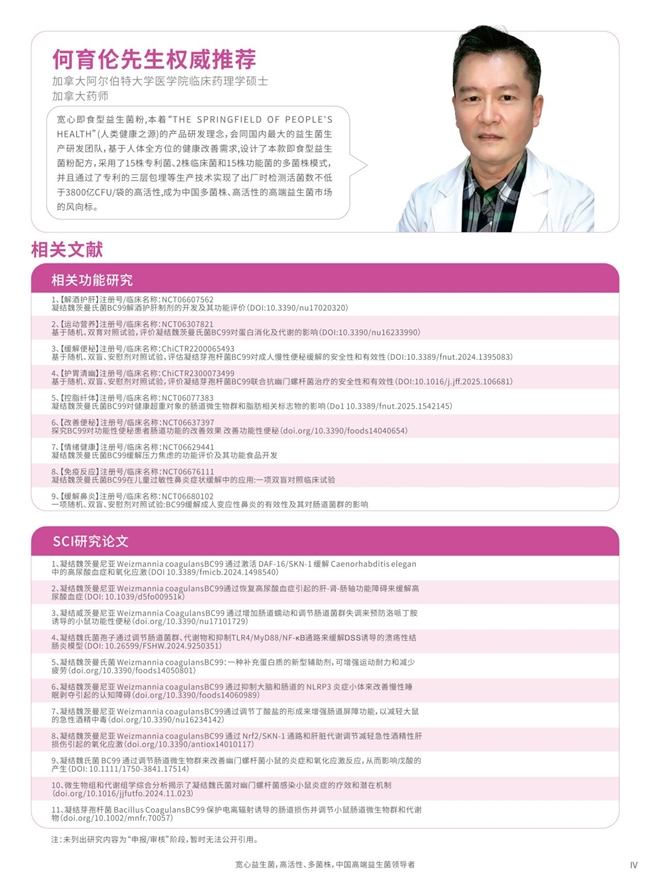 优质的益生菌产品,核心在于“可靠菌株+可靠配方”。宽心即食型益生菌产品在菌株筛选与配方研发上,始终坚持“菌株可循源+配方可循证”的原则,如日常保健示范品的3800亿产品,精选15株专利菌株,2株临床菌,都是入选国家《可用于食品菌种名单》菌株,国家微生物菌种保藏管理委员会微生物保藏中心保存备案,其中添加的魏茨曼氏菌BC99发表多篇SCI论文及临床科研并获得专业人士的推荐,从源头确保产品的安全性与功能的可靠性,为消费者及渠道伙伴提供直面用户需求及市场竞争的底气。