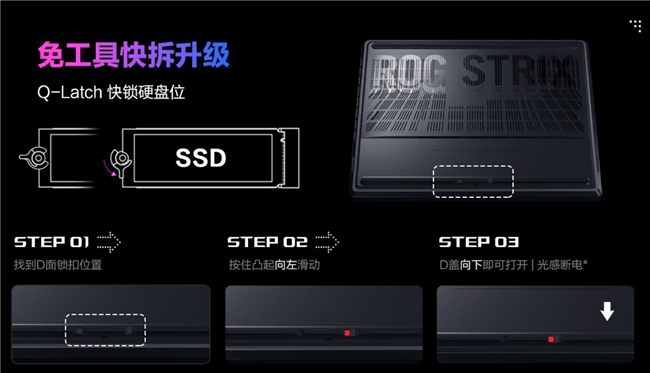 值得一提的是,ROG魔霸新锐还创新性地采用了免工具快拆设计。无需任何工具,玩家能够非常便捷的打开D壳,从而完成内存固态的升级或更换,以及散热模组的养护等操作。另外内部主板还有光线传感器,支持光感断电功能,有效保障了玩家自己操作DIY的安全性。