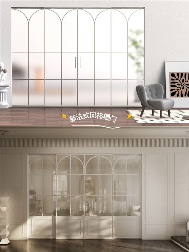 法式风格适合纤细金/银色型材+弧形格栅,搭配夹丝玻璃,浪漫慵懒的氛围感与生俱来;