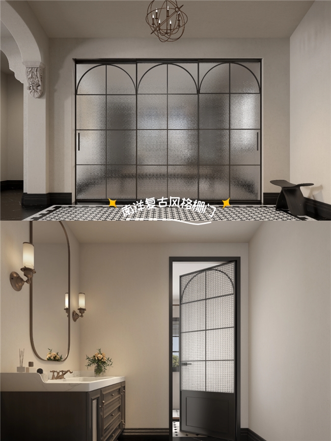 南洋复古风则可选深柚木色、旧黄铜色或黑色型材,搭配弧形格栅与茶色系渐变玻璃或复古海棠花玻璃,温润与复古碰撞出独特韵味。