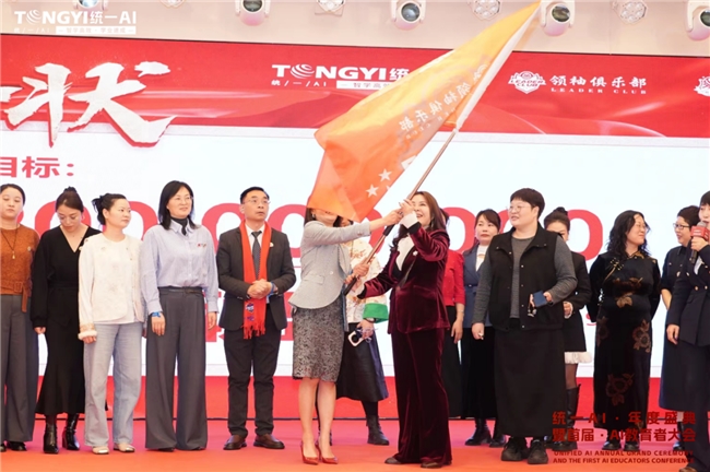 激昂乐声中,统一AI领袖俱乐部理事长晴总为八大联盟盟主隆重授旗。旌旗猎猎,壮志昂扬,这是荣誉的传承,更是责任与使命的庄严交接。