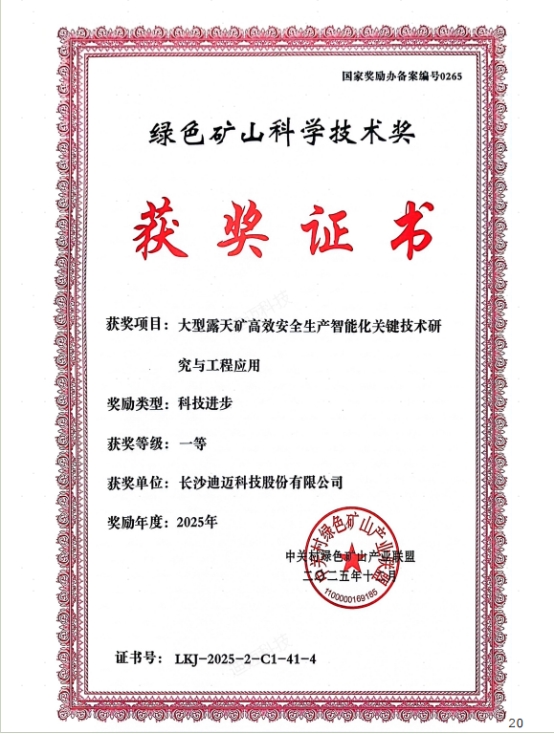 本届年会的一项重要成果,是对推动绿色矿山建设具有示范意义的优秀项目进行表彰。由迪迈科技、中广核铀业、中南大学、刚波夫矿业携手打造的智能化建设项目,凭借其在提升资源回收率、优化能耗管理及实现安全绿色生产方面的显著成效,荣获绿色矿山科学技术奖一等奖。这一殊荣是行业对项目成果的高度认可,也充分展示了公司在矿业智能化与绿色矿山领域的创新能力与技术领先水平。