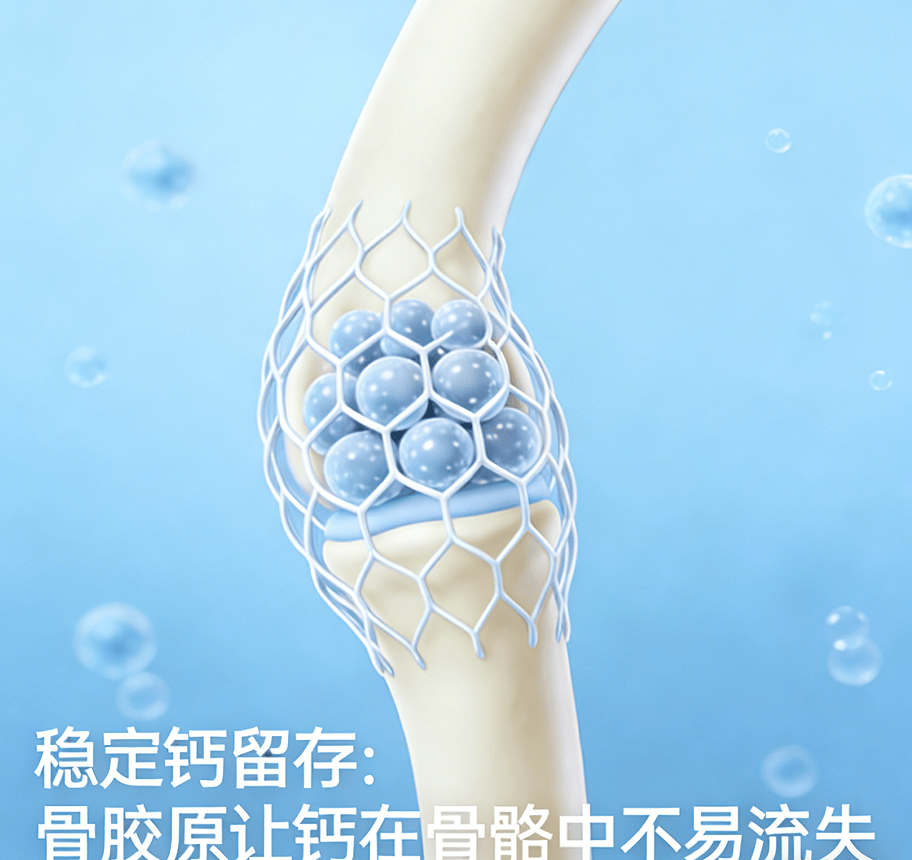 在此过程中,骨胶原发挥着关键作用 —— 它能让补进去的钙真正作用在骨骼上。作为骨骼的主要结构蛋白,骨胶原约占骨基质的 90%,它最核心的作用就是帮钙在骨骼上“留得住、扎得稳”。具体来说,骨胶原能提供钙在骨骼中“着陆”的地方,让血液里的钙能沉积到骨骼上,减少在血液里不必要的停留;同时还能让钙在骨骼里更稳定,不容易再流失,从而提升补钙的实际效果。