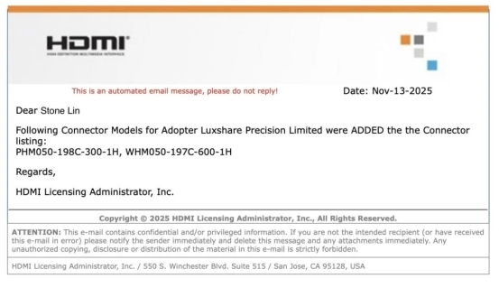 此次通过认证的HDMI 2.2连接器及配套测试治具,是立讯精密深耕高速互连技术领域的重要成果。双认证的同步达成,不仅印证了公司在产品研发、精密制造等环节的技术实力,更意味着其可向全球客户提供“产品+测试”一体化解决方案,为HDMI 2.2生态链的完善与落地提供关键支撑。