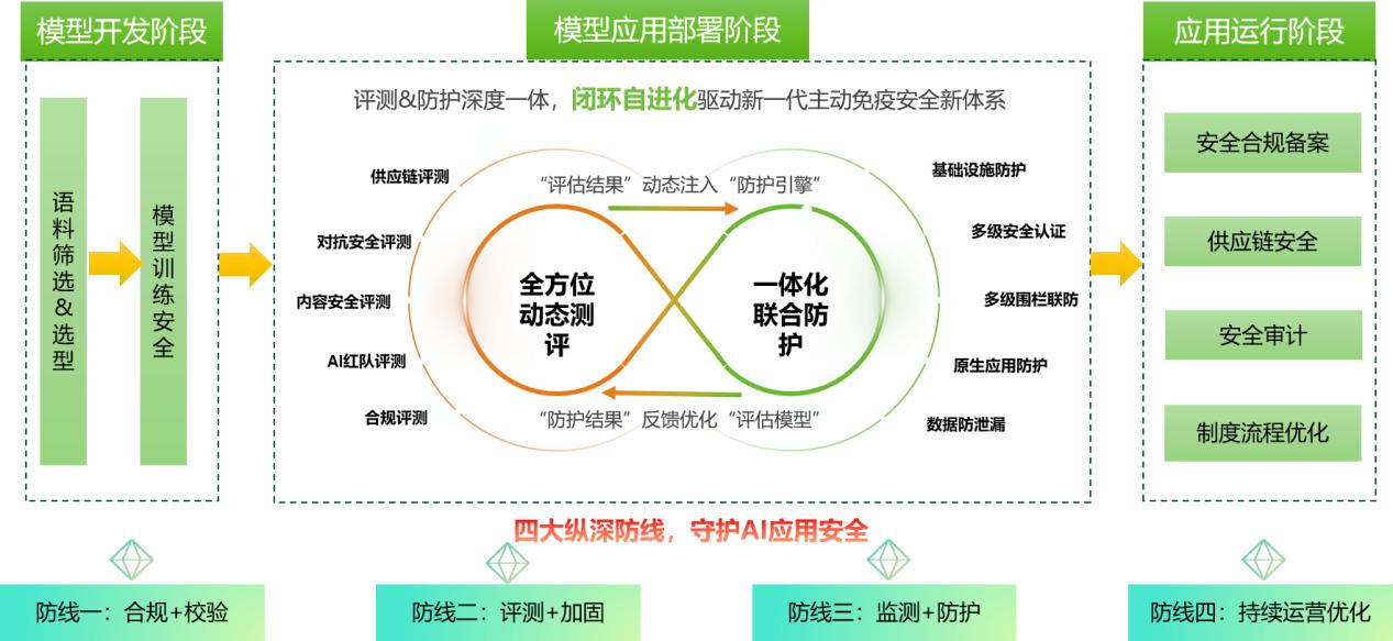 大模型系统部署阶段,构建“评测+加固”和“监测+防护”闭环自进化双道协同防线。让“评测”明确“防护”重点,“防护结果”反哺“模型评测”,打造“越用越聪明”的主动免疫体系。在大模型系统上线前,需围绕内容安全、对抗安全、AI红队、供应链等多维度开展安全评测,保障大模型系统安全上线;在大模型系统部署时,需围绕基础设施、模型、应用、数据等打造纵深防御,部署多级安全认证、多维联防围栏、原生应用防护、数据防泄漏等监测防护能力,打造特殊场景安全代答能力,守护大模型系统应用安全。