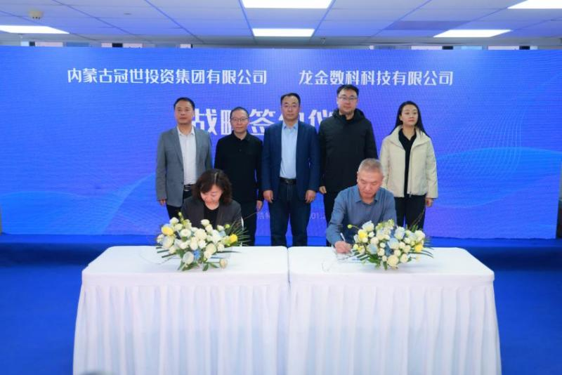 图片说明:内蒙古冠世投资集团党支部书记、副董事长李涛与龙金数科董事长索永鑫代表双方签约,标志着国资战略股东正式加入。
