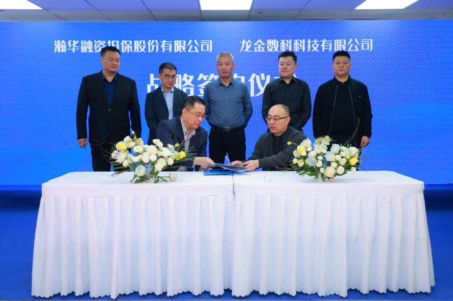 图片说明:龙金数科副总裁吝建国与瀚华金控副总裁、瀚华担保董事长、总裁季春江代表双方签约,共建业务风控协同机制。