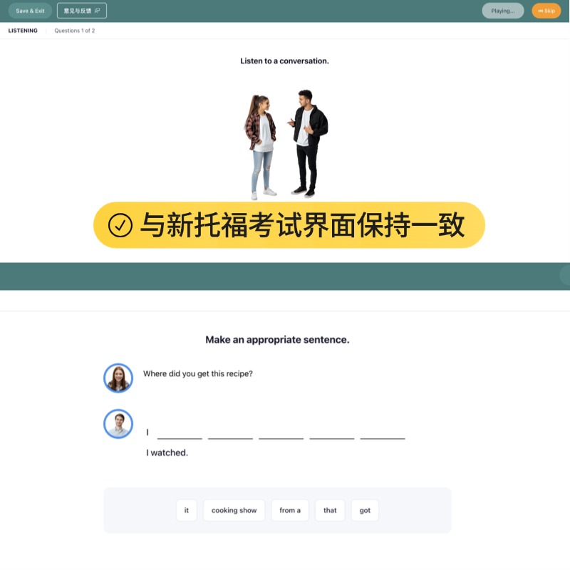 Lingoleap 新托福模考系统已同步该考试顺序,并完整纳入阅读与听力中的加试与自适应出题机制,确保模考流程与正式考试保持一致。