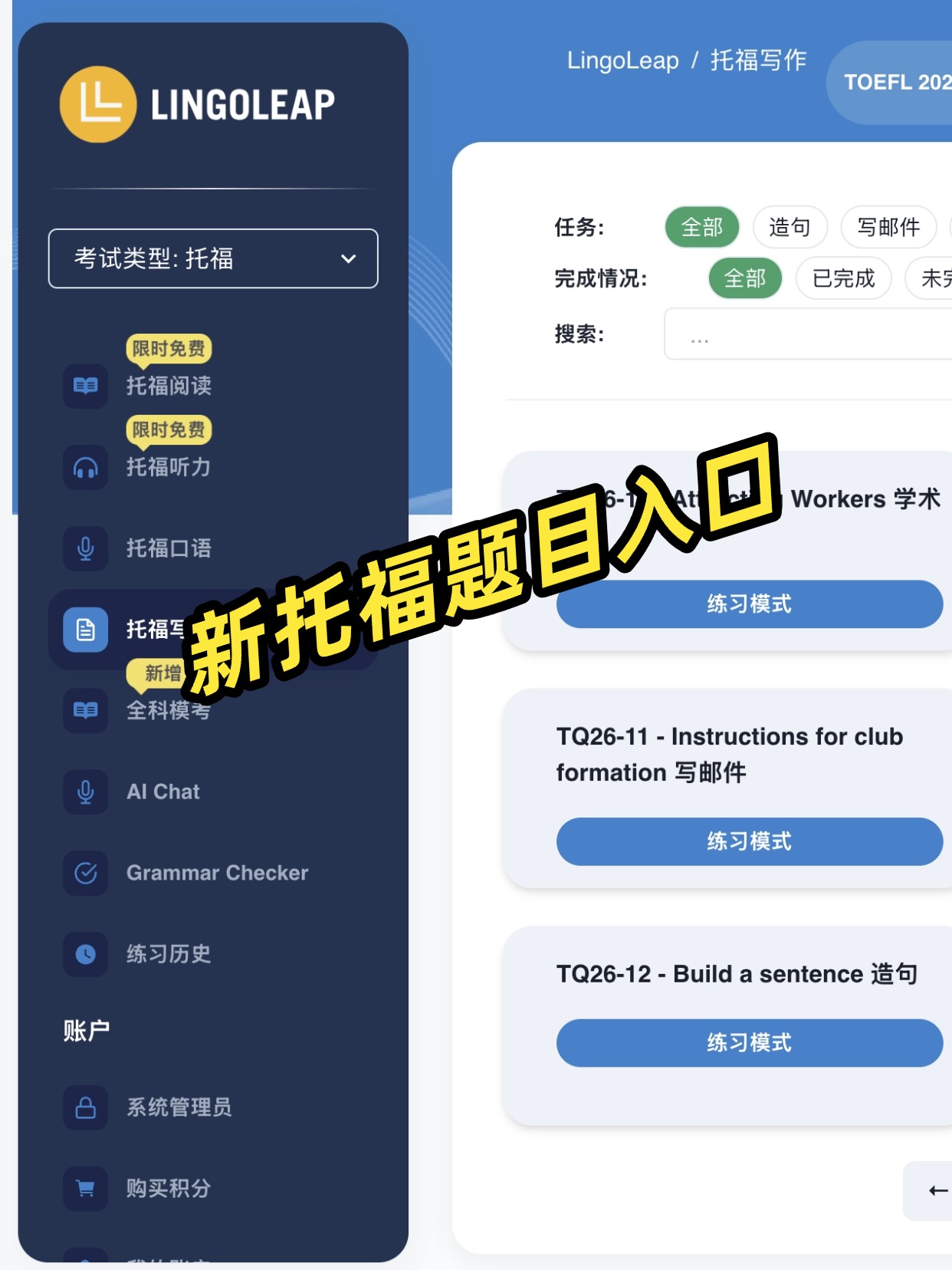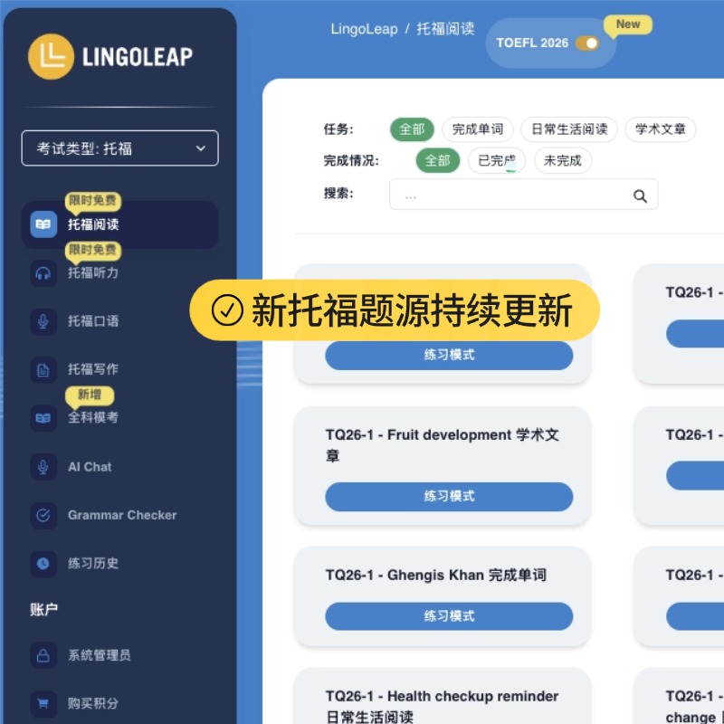 目前,Lingoleap 已上线 12 套适配新托福的完整练习,后续将陆续更新官方新题与自主出题内容,保障考生在整个备考周期内持续练习,不出现题源中断问题。