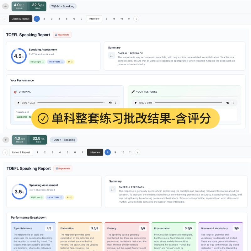平台完全复刻托福 iBT 的真实题型、难度与考试流程,从阅读、听力到口语、写作,提供高度贴近真实考试的沉浸式模考体验,帮助考生提前熟悉考试节奏与细节。