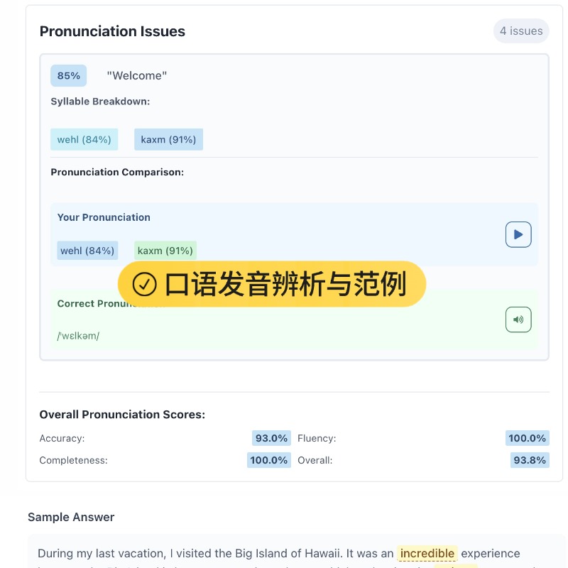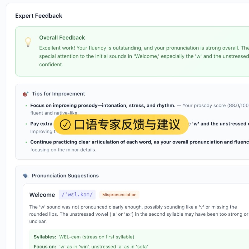 所有消耗积分的练习项目均包含自动评分与表现反馈服务。