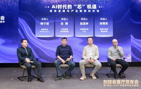 活动的最后一场圆桌对话以“AI时代的‘芯’机遇:投资逻辑与产业破局的对话”为主题,凯联资本硬科技合伙人姚宁波、中科创星投资副总裁岳腾、锐泰微科技CEO赵嘉林、铭镓半导体副总经理邱理奕共同探讨了半导体产业现状与未来。