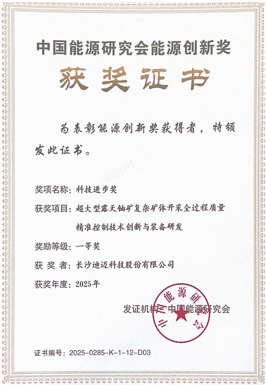 日前,长沙迪迈科技股份有限公司作为主要参与单位完成的科研项目《超大型露天铀矿复杂矿体开采全过程质量精准控制技术创新与装备研发》,荣获中国能源研究会能源创新奖(科技进步奖)一等奖。本届奖项共申报项目546项,涵盖能源勘探开发、工程技术、装备研发及数字化应用等多个领域,竞争激烈、评审严格,该项目凭借突出的技术创新性和显著的工程应用价值从众多项目中脱颖而出。