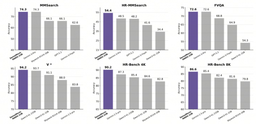 在 MMSearch 榜单(图文搜索核心评测)中,模型以 74.27 分登顶,超GPT-5.2(66.08 分);HR-MMSearch(高清细节搜索评测)中以54.43 分领先,显著拉开与闭源模型的差距。