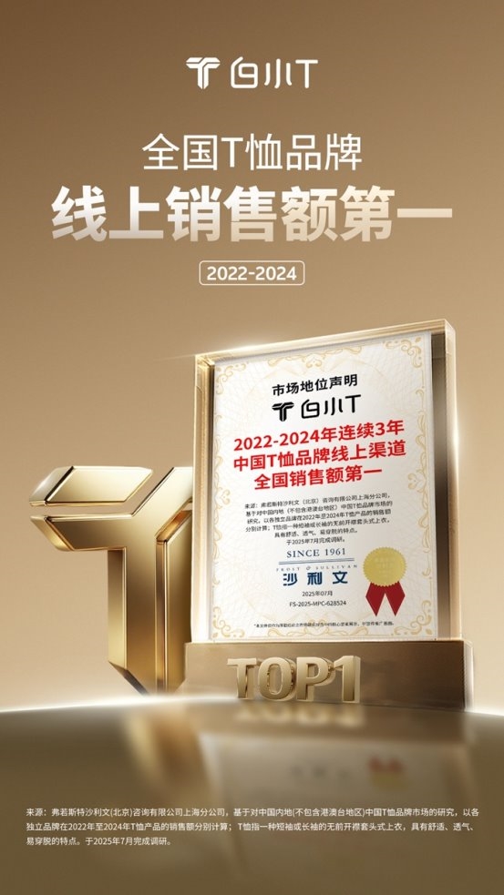 自创立以来,白小T持续深耕T恤品类,聚焦服装科技创新应用,重新定义“好T恤”的标准。2025年秋冬,白小T重磅推出的“热力系列”融入了多项科技,旨在进一步提升用户穿着体验,不断探索与拓宽T恤品类边界。基于持续的产品创新与市场认可,白小T已获得全球知名增长咨询公司弗若斯特沙利文(Frost & Sullivan)认证——连续三年(2022-2024)蝉联中国T恤品牌线上渠道销售额第一,品牌实力再获权威背书。
