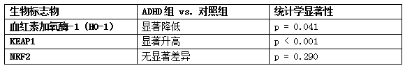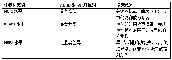 越来越多的证据表明,氧化应激在ADHD的病理生理机制中扮演着核心角色。一项针对ADHD儿童的临床研究直接检测了内源性抗氧化防御系统的关键通路—Nrf2-KEAP1通路,发现了明确的失衡。该研究比较了41名ADHD患儿与34名健康对照儿童的血清指标,结果如下: