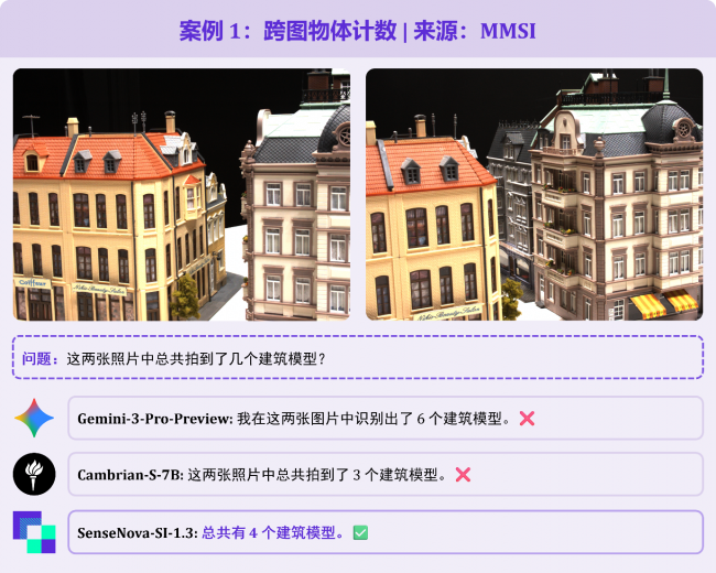 题目要求统计两张照片中建筑模型的总数量,核心难点是理解两张图的对应关系,以此避免遮挡漏数和重复多数。图2视角下显现出图 1 中被遮挡的深灰色建筑,且部分模型在两图中重复出现。Gemini-3-Pro未完全去重,误数为 6 个;SenseNova-SI-1.3则给出 “4 个”的准确答案。