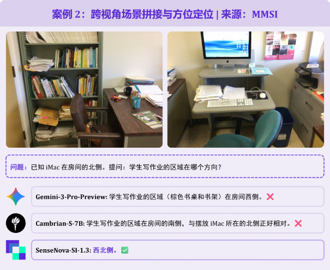 题目给出两张书房局部照片,已知 iMac 位于房间北部,询问学生写作业区域的方位。需先理解两张图片属于同一空间,再通过视觉线索拼接场景。Gemini-3-Pro误判学习区在西侧;SenseNova-SI-1.3精准定位 “西北角”,完全符合空间逻辑。