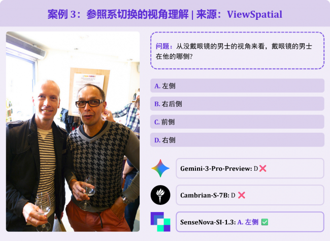 题目要求以 “未戴眼镜男士的自身视角” 判断身旁戴眼镜男士的方位,考察 “参照系转换” 能力,模型很容易以“观察者视角”来判断方向。Gemini-3-Pro就误选了 “右边”;SenseNova-SI-1.3则能正确给出 “左边” 的正确答案。