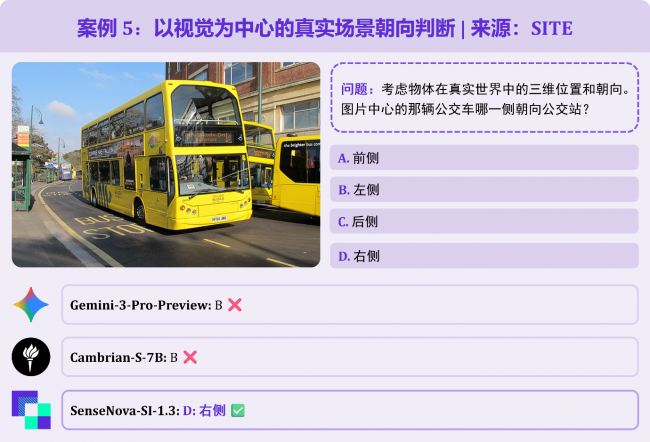 以双层巴士与公交站的场景为题,需避免陷入“英国巴士靠左行驶,因此靠站的是左侧”的常识陷阱,而是通过实际的视觉画面判断方位。Gemini-3-Pro误判 “左侧” 为答案;而 SenseNova-SI-1.3 则准确理解 “右侧” 为正确答案。