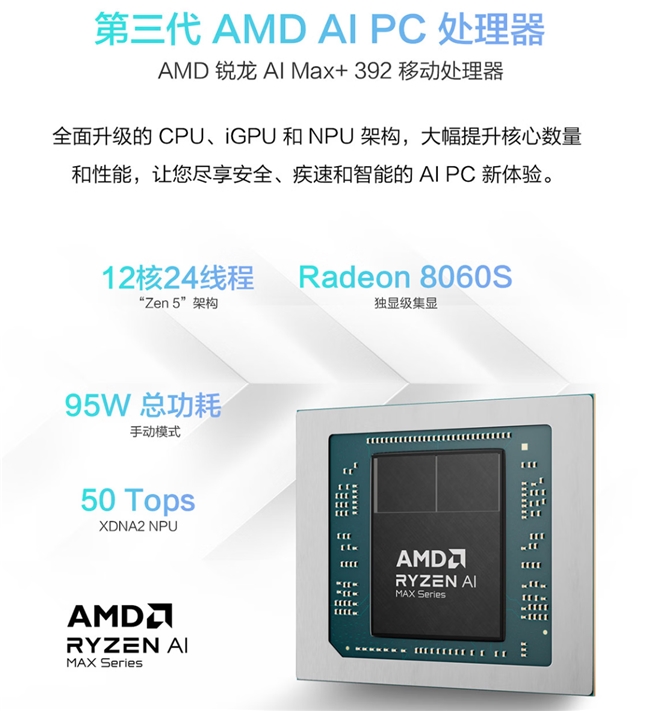 AMD 锐龙 AI Max+ 392 处理器作为 锐龙 AI Max+ 系列的新成员,将高性能 AI 计算能力、集成的独显级性能显卡以及统一内存架构引入高端超轻薄笔记本中,NPU算力高达50 TOPS,在不牺牲便携性与用户体验的前提下,轻松应对高强度创作与 AI 工作负载以及沉浸式游戏体验。