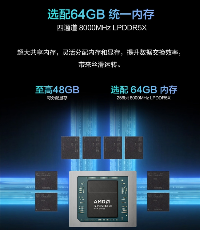 这款最新的锐龙 AI Max+ 系列处理器结合了高能效的AMD “Zen 5” CPU 核心、AMD Radeon 8060S 系列显卡,以及基于第二代 AMD XDNA 架构的 NPU,带来出色的整体性能。无论是加速大语言模型、渲染高分辨率媒体内容,还是在高设置下畅玩当代主流游戏,锐龙 AI Max+ 系列处理器都能在高端超轻薄设计中提供全方位、不妥协的性能表现。