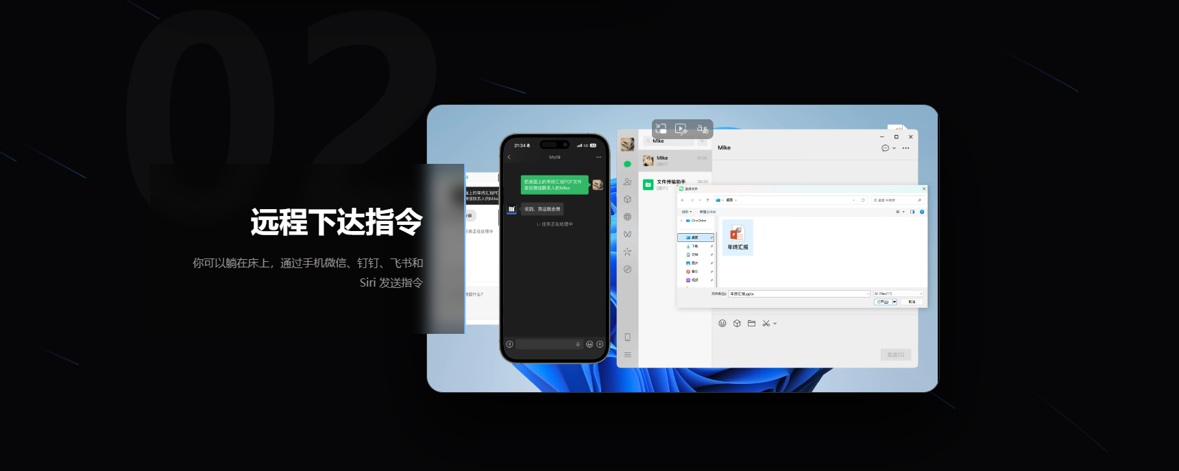 Molili最具杀伤力的功能,是彻底打破了设备边界。你不需要安装额外的远程控制APP,只需扫码绑定微信,对话框就成了你的“指挥中心”。无论是在通勤地铁上,还是躺在卧室床上,发条微信指令,家里的电脑就能自动跑脚本、发邮件、下载文件。这种“发指令而非开坦克”的体验,让远程控制变得前所未有的轻松。