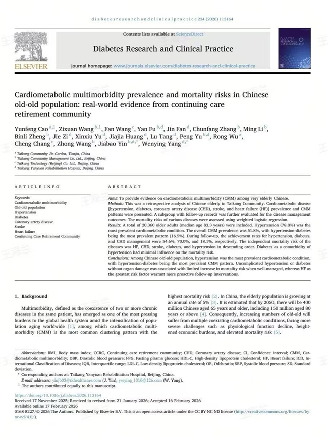 泰康之家又传捷报!近日,泰康之家首席专家、国内著名内分泌与糖尿病学专家杨文英教授撰写的学术论文《Cardiometabolic multimorbidity prevalence and mortality risks in Chinese old-old population: real-world evidence from continuing care retirement community》(中国高龄老人心代谢性共病患病率及死亡风险:来自持续照料退休社区的真实世界证据) 发表于国际糖尿病联盟官方权威期刊,中科院一区TOP期刊——Diabetes Research and Clinical Practice,影响因子高达7.4!