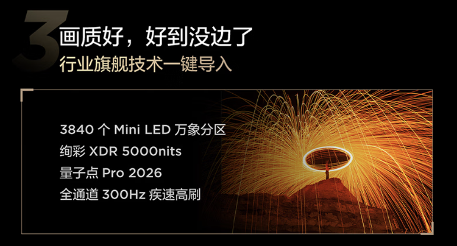 在亮度与色彩维度,新品搭载了绚彩XDR 5000nits峰值亮度(65英寸版本为4500nits),配合量子点Pro 2026技术,实现了98% DCI-P3广色域覆盖。高亮度的意义不仅在于HDR片源的高光还原,更在于通过超动态控光算法,让高亮画面显示时间得到数倍延长,彻底解决了传统峰值亮度“转瞬即逝”的痛点。