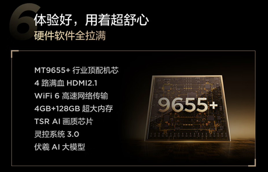 游戏性能上,支持原生4K 150Hz刷新率及全通道300Hz动态加速,配备4路满血HDMI2.1接口。针对三大主机玩家,产品内置了典藏皮肤和游戏妙控台,支持辅助瞄准自定义和响应时间自定义,让电视不仅是显示设备,更成为游戏氛围的一部分。