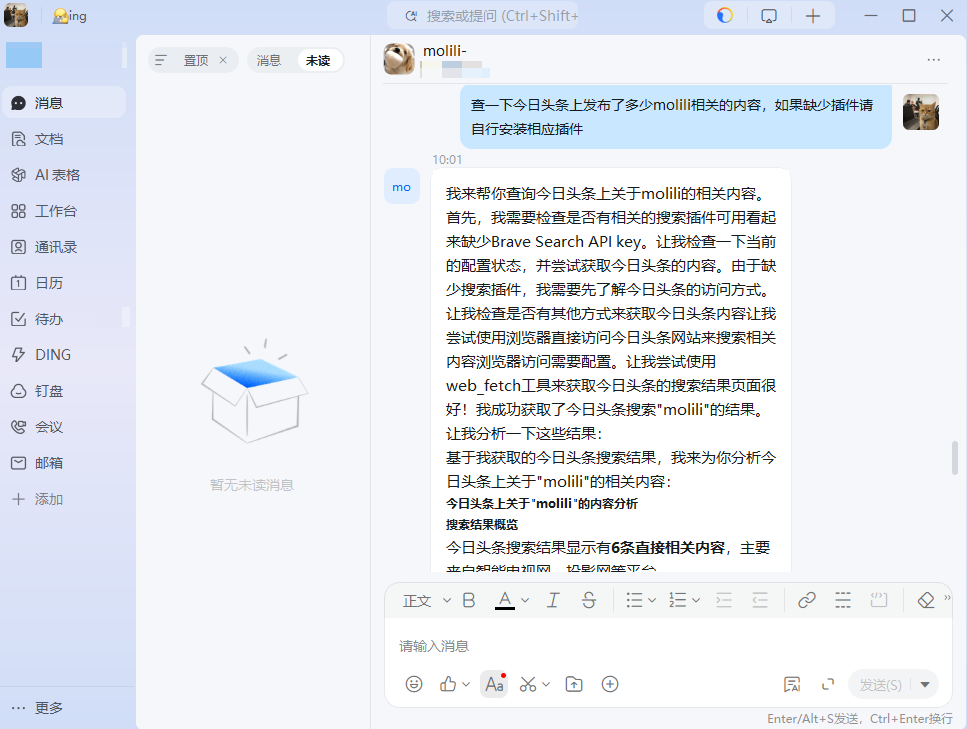 Molili已全面打通移动端与PC端的连接,支持用户通过手机端在钉钉、飞书、微信等软件中进行远程交互。这意味着,即使你不在电脑前,也能随时随地指挥Molili处理紧急工作,真正实现“数字分身”随时待命。此外,Molili还支持定时任务机制,如设定每天清晨自动搜集行业新闻、整理邮件摘要,让用户在开始工作时,所需资料已准备就绪,进一步提升工作效率。