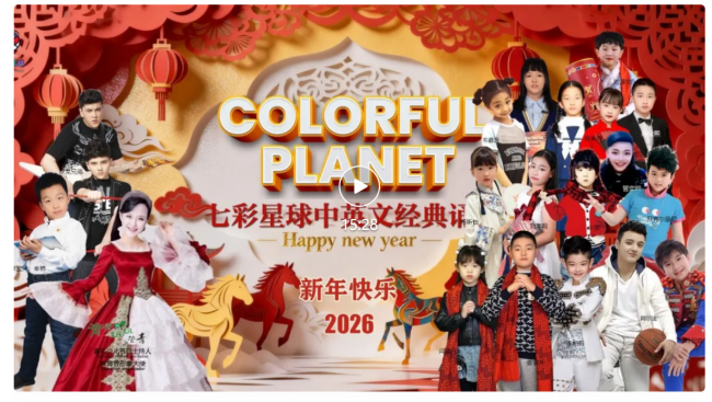 Happy Chinese lunar New Year!七彩星球贺新年 双语主播青青姐姐Qing管青阿尔法Nick大龙阿尔法小龙 牟桥小宝开克尔曼尼载歌载舞领衔2026贺岁 七彩星球中英文经典诵读我来了,我是QING青青,我是NICK大龙,七彩星球贺新年,万事如意幸福年, 身体健康万万年。七彩星球骐骥驰骋踏新程,势不可挡,一马当先,龙马精神,马到成功,马年大吉!春节快乐! 元宵节快乐!