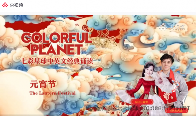 七彩星球中英文经典诵读我来了,我是QING青青,七彩星球贺新年,万事如意幸福年, 身体健康万万年。元宵节快乐!In the north customs, is to eat dumplings, dumplings homophonic jiaozi, expressed the people to the more old hand, a desire for the New Year auspicious rich. While southerners like to eat sweet dumplings in the annual morning, means that we in the New Year festive, reunion.在我国的北方有一种习俗,就是吃饺子,饺子的谐音即“交子”,表达了人们对更岁交子,对新的一年吉祥富裕的一种渴望。而南方人则喜欢在大年的早晨吃汤圆和八宝饭,意味着我们在新的一年里圆圆满满,团团圆圆。