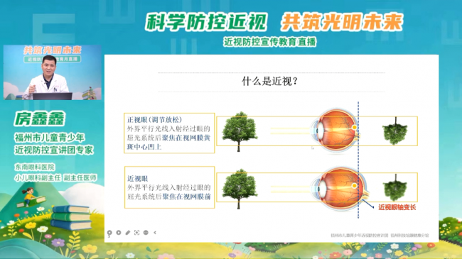 直播专家,福州市儿童青少年近视防控宣讲团专家、东南眼科小儿眼科副主任房鑫鑫副主任医师从眼球发育的过程和儿童视力发展规律入手,结合不同年龄段儿童青少年用眼场景深入浅出地讲解了诱发近视的风险因素、近视发展的危害、行为干预及医疗干预手段等实用知识,并结合门诊经验,分析讲解了学生、家长在近视矫正方面的常见误区。