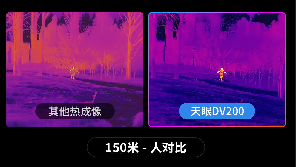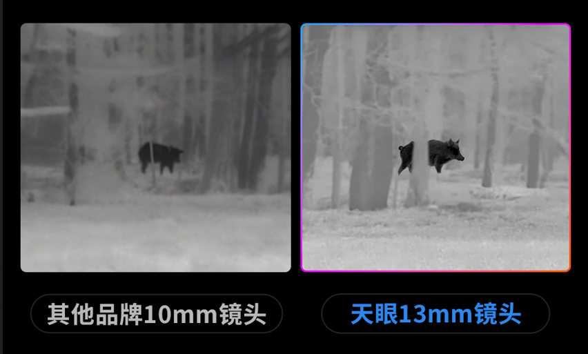 除了探测器和算法,热成像镜头光圈同样影响实战效果。F0.8甚至F0.9的大光圈镜头,相比常见的F1.0或F1.2,能够汇聚更多红外辐射,显著提升图像信噪比。这意味着在黄昏、黎明等弱热辐射时段,画面依然干净通透。天眼热成像的DV200等机型搭载13mm F0.8大光圈镜头的配置,热感通量更高,热源观测更清晰,这种硬件投入直接转化为用户实际观测时的体验提升。